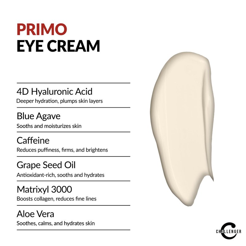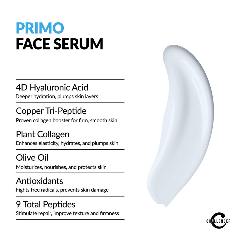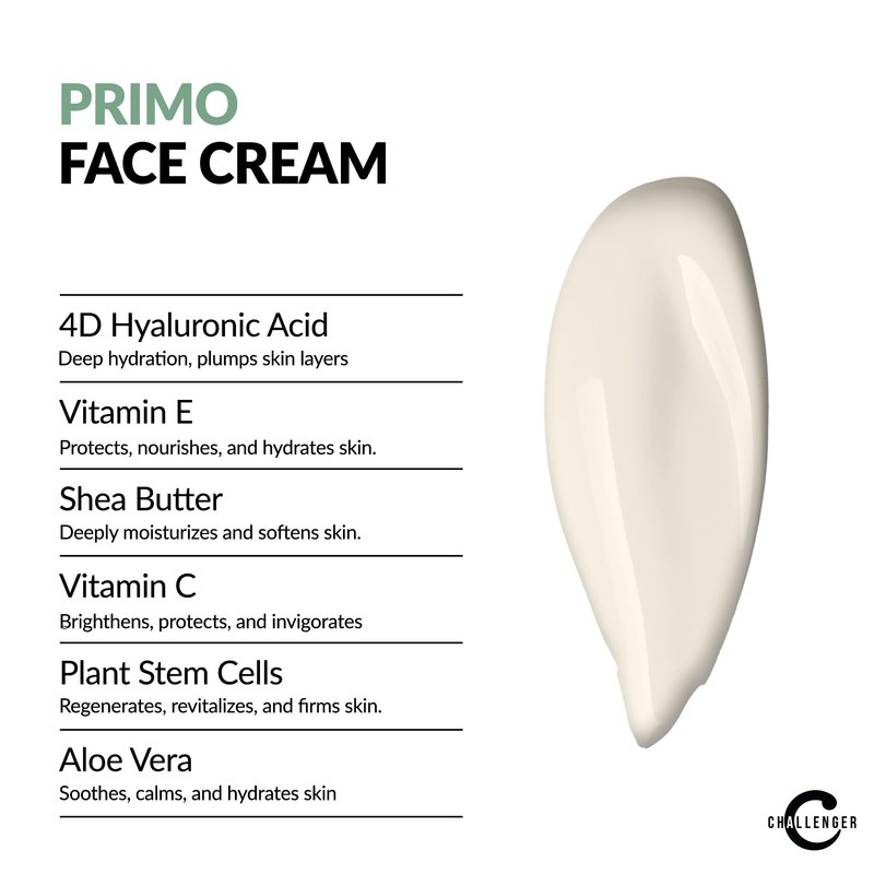 - The Goods: With Plant Stem Cells for rejuvenation, 4D Hyaluronic Acid, Aloe, Matrixyl 300, Vitamin C & so much more, Challenger’s Primo Series are Mineral Oil Free, Silicone Free, Paraben Free, Fragrance Free to help keep your face happy and smiling for years to come