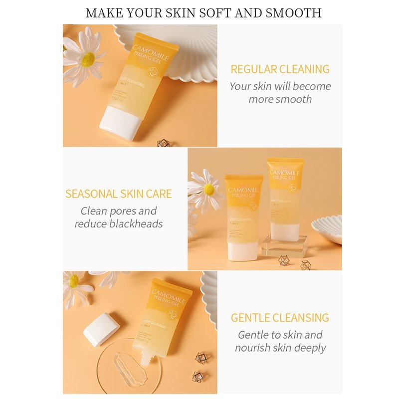 - 【Advantages】With this camomile exfoliating peeling gel, you can clean pores, reduce blackheads, reduce acne, tighten and moisturize, moisturize and repair, improve skin tone, soften redundant cuticle, deeply nourish skin while cleaning,gentle on skin, and make your skin smoother.Not only for the face, but also for cleaning elbows, feet, back, knees, etc
