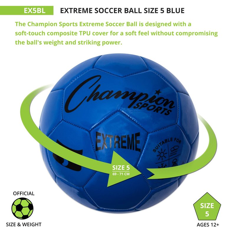 Champion Sports Extreme Series Soccer Ball, Regulation Size 5 - Collegiate, Professional, and League Standard Kick Balls - All Weather, Soft Touch, Maximum Air Retention - for Adults, Teenagers, Blue