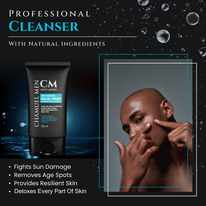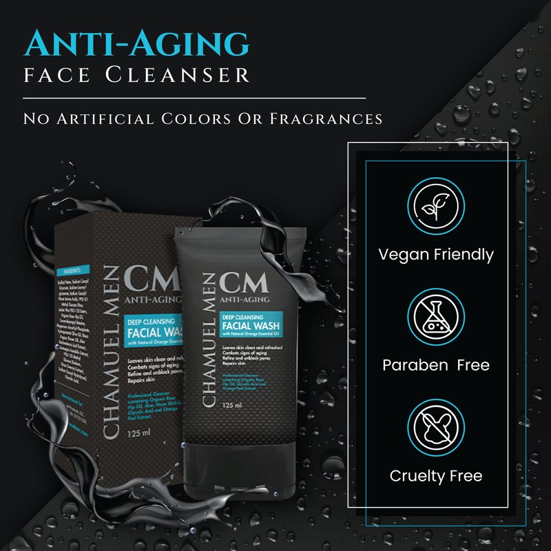 CHAMUEL MEN Anti-Aging Face Cleanser - Deep Cleaning & Exfoliating Mens Face Wash Fights Acne & Wrinkles w/Organic Rose Hip, Aloe & Glycolic Acid for Oily, Dry, Sensitive or Combination Skin, 125ml.