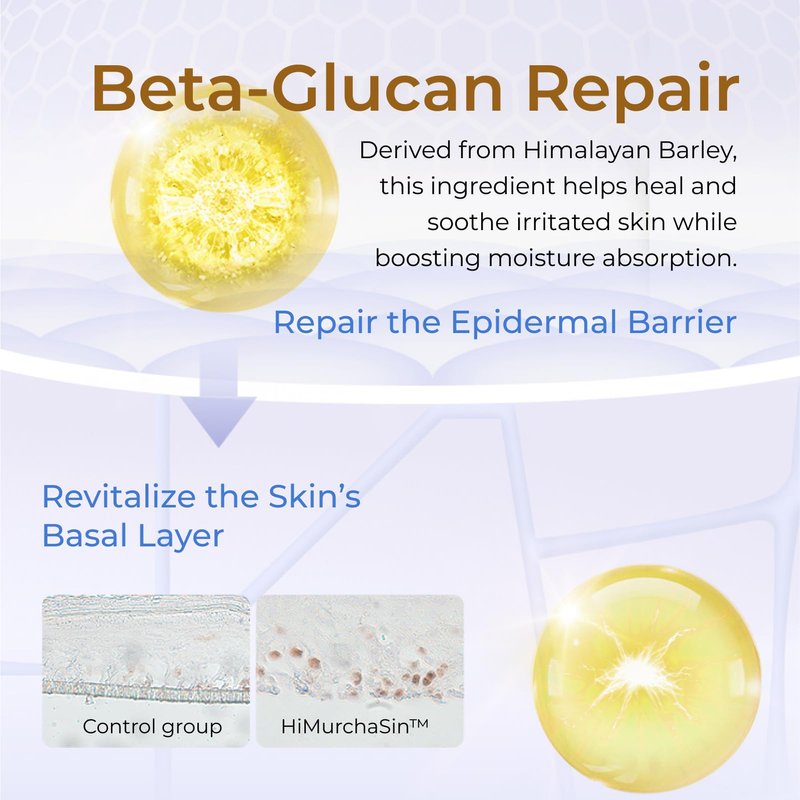 - Skin Defense and Hydration: Derived from Himalayan barley, β-glucan improves skin's defense against environmental stressors, soothes irritation, and locks in moisture for enhanced absorption.