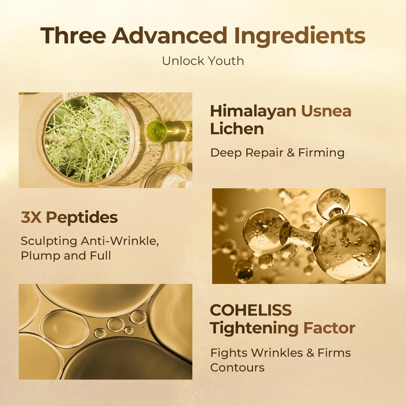 - Three Cutting-Edge Ingredients forRestoring Youthful Skin: A powerful blend of three advanced anti-aging ingredients. Himalayan Usnea Lichen deeply repairs and firms the skin. 3X Peptides help sculpt facial contours, smooth wrinkles, and enhance plumpness. COHELISS tightening agent targets deep lines, boosting skin elasticity and defining facial contours for a more youthful appearance.