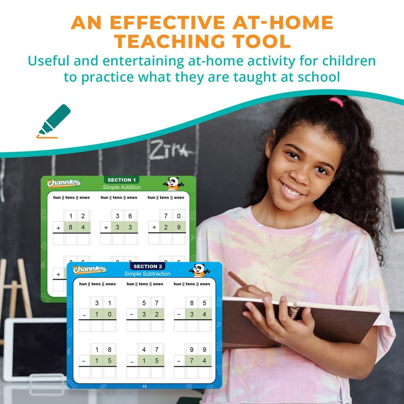 The boxes are large and numbers are lined up for children to concentrate easily on the operations while improving their penmanship. The color-coded blocks aid in tracing uniform number sizes and alignment.