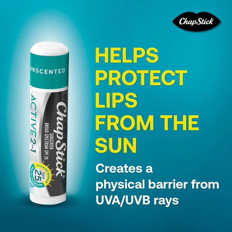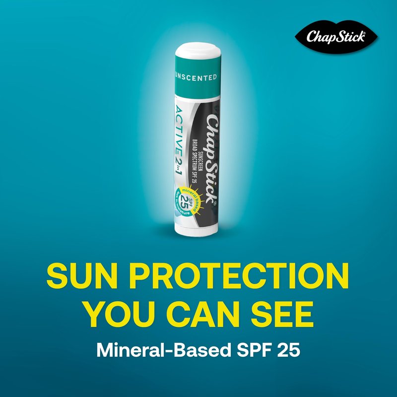 ChapStick Active 2-in-1 Unscented Flavored Lip Balm Tubes with Mineral Based SPF 25 Sunscreen - 0.18 Oz (Pack of 3)