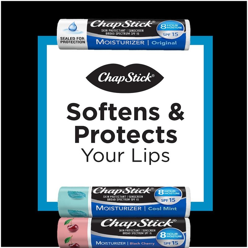 - HYDRATING LIP TREATMENT: This bundle features ChapStick Original Moisturizer 2-in-1 Lipcare (3 tubes) plus Cool Mint (1 tube) and Black Cherry (1 tube) – formulated with broad-spectrum SPF 15 protection.