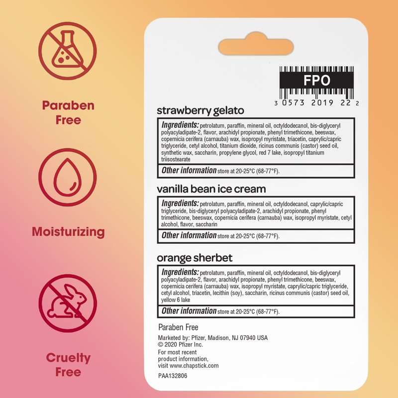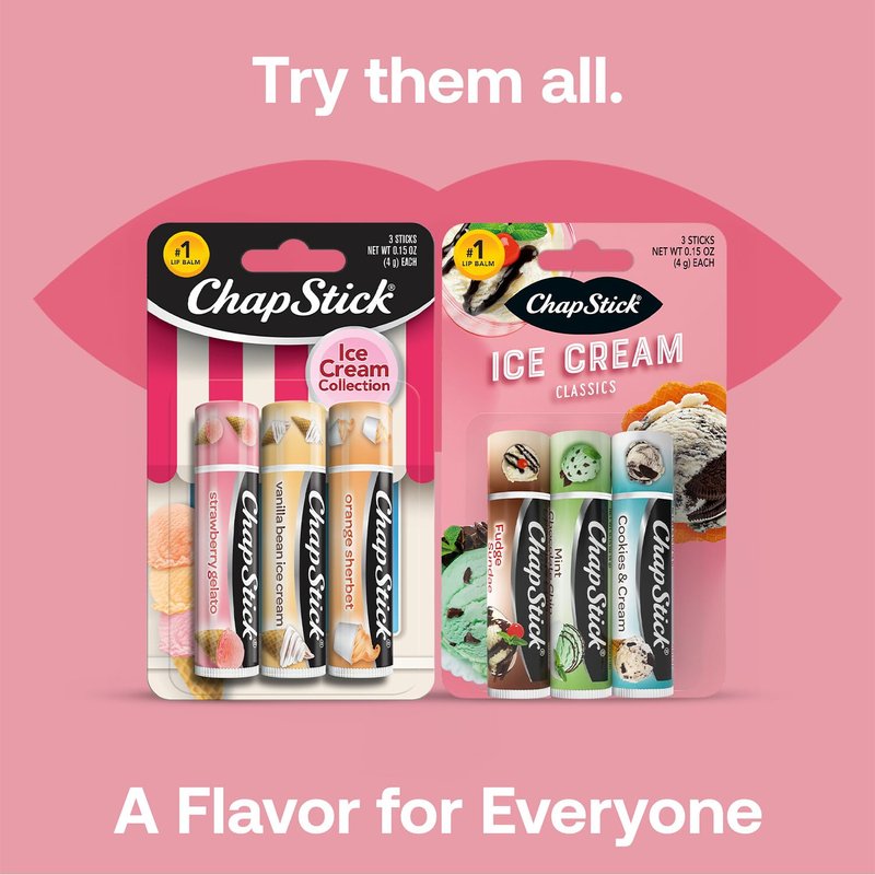- CHAPSTICK FAN FAVORITE: This collection of moisturizing lip balms includes three yummy ice cream flavors: Strawberry Gelato, Vanilla Bean Ice Cream, and Orange Sherbet.