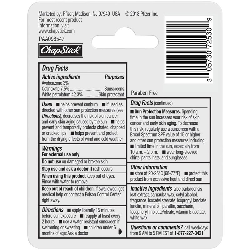 - One pack of three 0.15-ounce ChapStick Moisturizer Original Lip Balm Tubes, SPF 15 and Skin Protectant