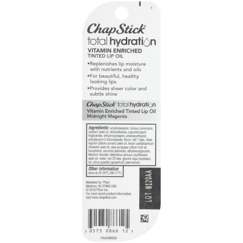 - One 0.24-ounce ChapStick Total Hydration Vitamin Enriched Midnight Magenta Tinted Lip Oil Tube, Lip Care