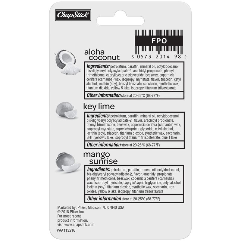 - Limited Edition Tropical Paradise flavored lip care ChapStick variety pack comes with ChapStick key lime, ChapStick mango and ChapStick coconut lip balm flavors