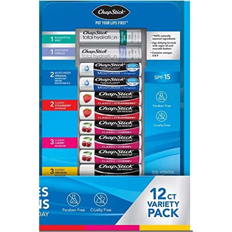 ChapStick Variety Pack Classic Original, Cherry, Strawberry, Lip Moisturizer & Total Hydration (12 ct.)