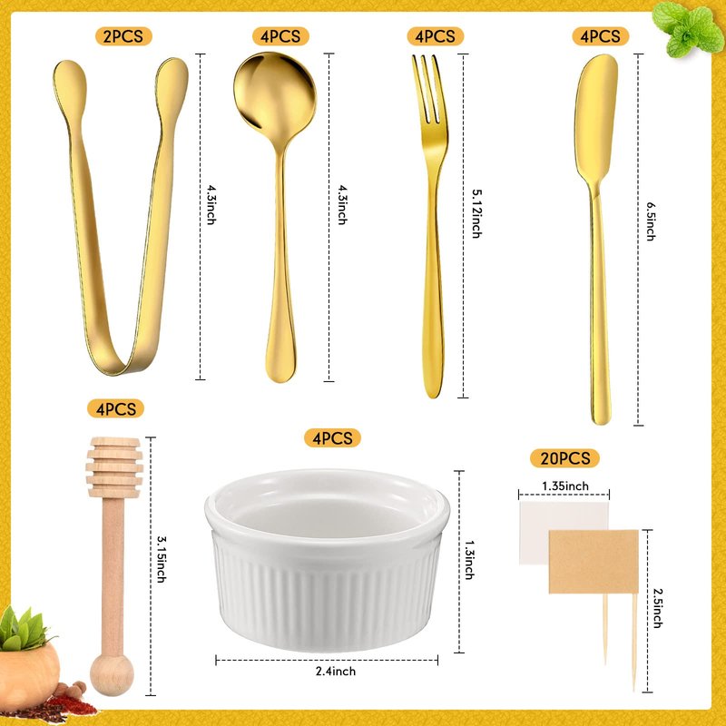 - Package Including: charcuterie board accessories have 4 spoons measuring approximately 4.3 inches/11 cm in length and 1.2 inches/3 cm in width, 4 dessert forks measuring 5.5 inches/13 cm in length, 2 mini serving tongs measuring 4.3 inches/11 cm in length and 4 pieces of knives, all in gold color, as well as 4 mini sized bowl, 20 mini toothpick flags, and 4 honey dippers measuring 3 inches/8 cm; The nice match can be suitable to meet your daily use and replacement needs