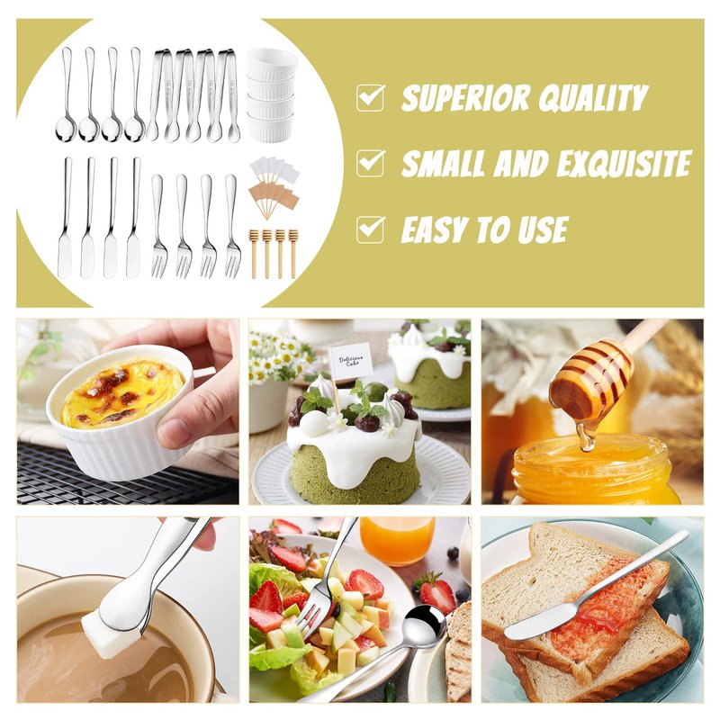 - 【Multifunctional and Easy to Use】Multifunctional butter cheese jam spreader knife, comfortable to hold, seamless integrated process, smooth and safe. Mini serving tongs are made of high-quality stainless steel, which is not easy to bend and deform, and can easily pick up all kinds of delicious food. Mini spoons and forks, easy to hold, use as you like, very convenient. Ceramic dipping bowl can be used to hold a variety of condiments, jam, honey, dessert, etc., widely used.