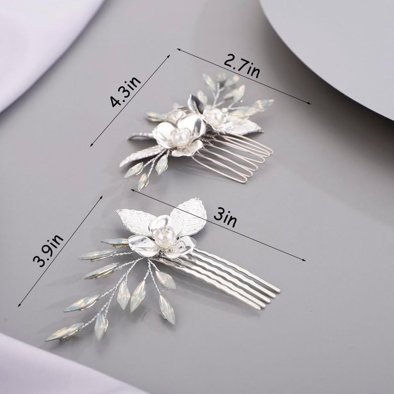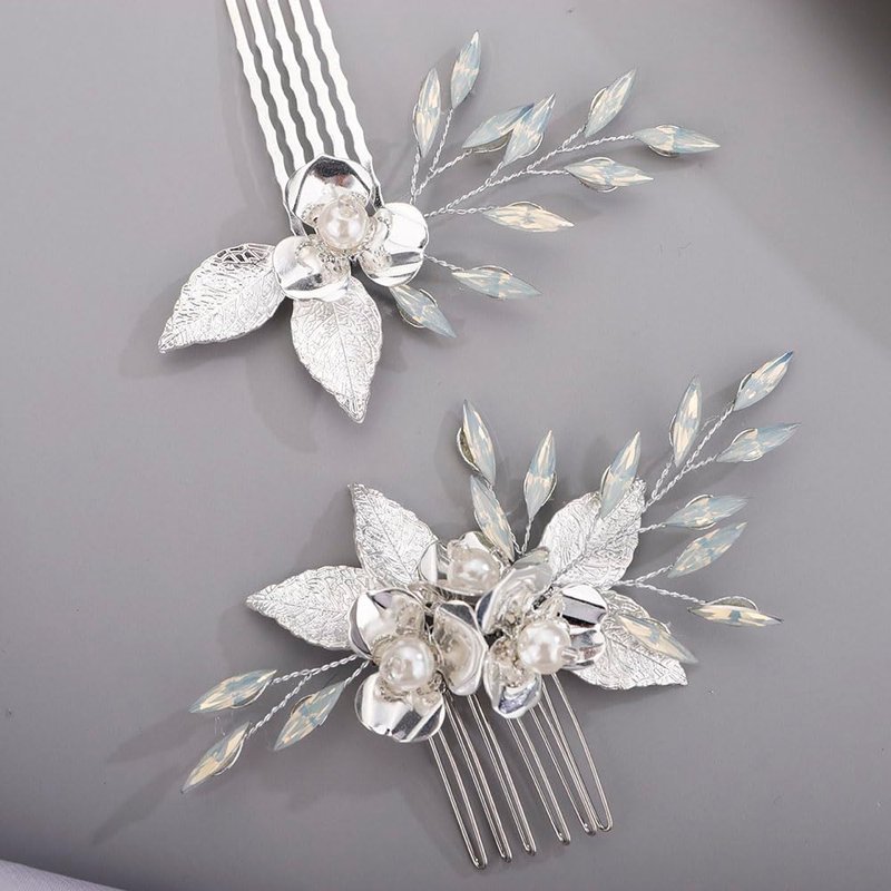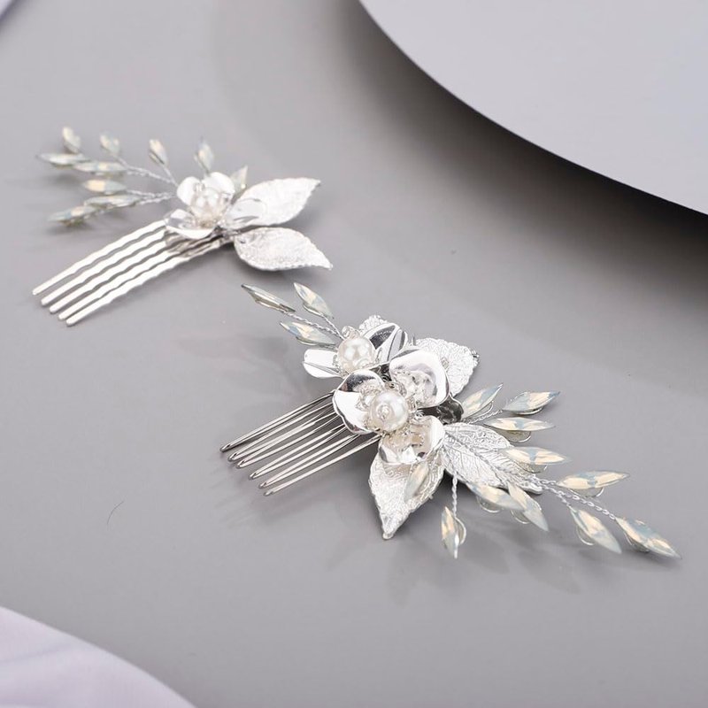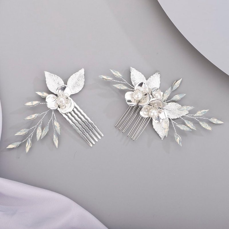 Chargances 2pcs Wedding Silver Flower Leaf Hair Comb Bridal Pearl Handmade Hair Side Comb Set Bride Flower Hair Piece Wedding Hair Accessories for Women and Girls (Silver)