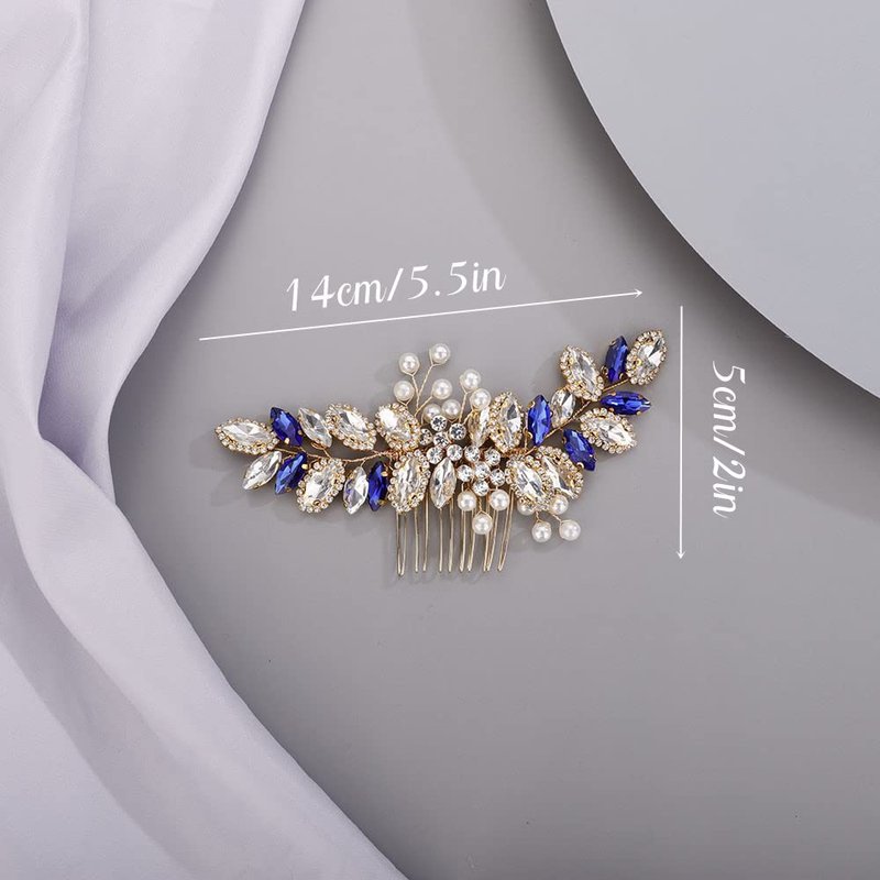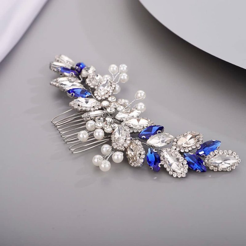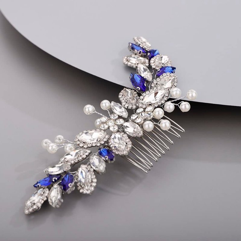 Chargances Blue Crystal Bride Wedding Hair Comb Pearl Rhinestone Sapphire Hairpins Gift for Women and Girls (Silver)