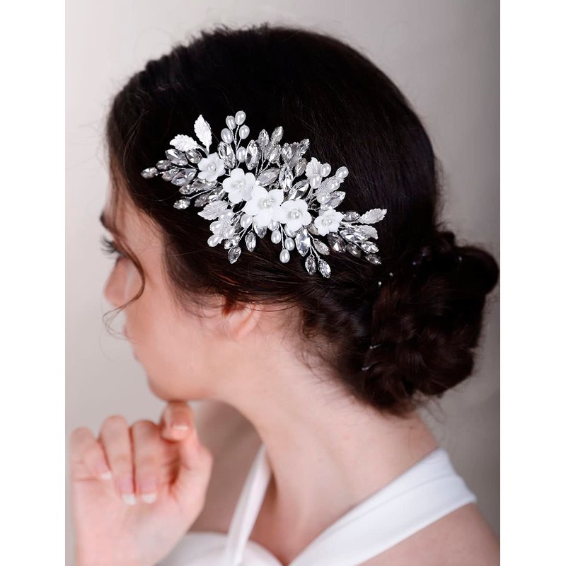 Chargances Bridal Flower Rhinestone Hair Comb Wedding Pearl Leaf Hair Side Comb Fashion Crystal Handmade Hair Accessories for Women and Girls (Rose Gold)