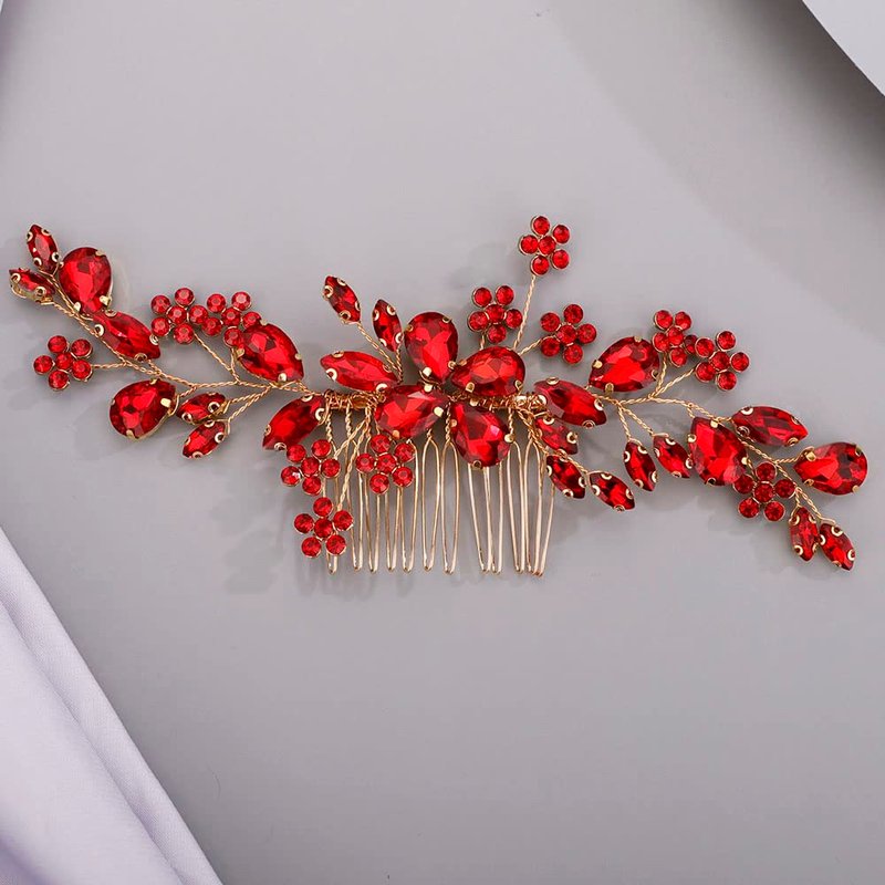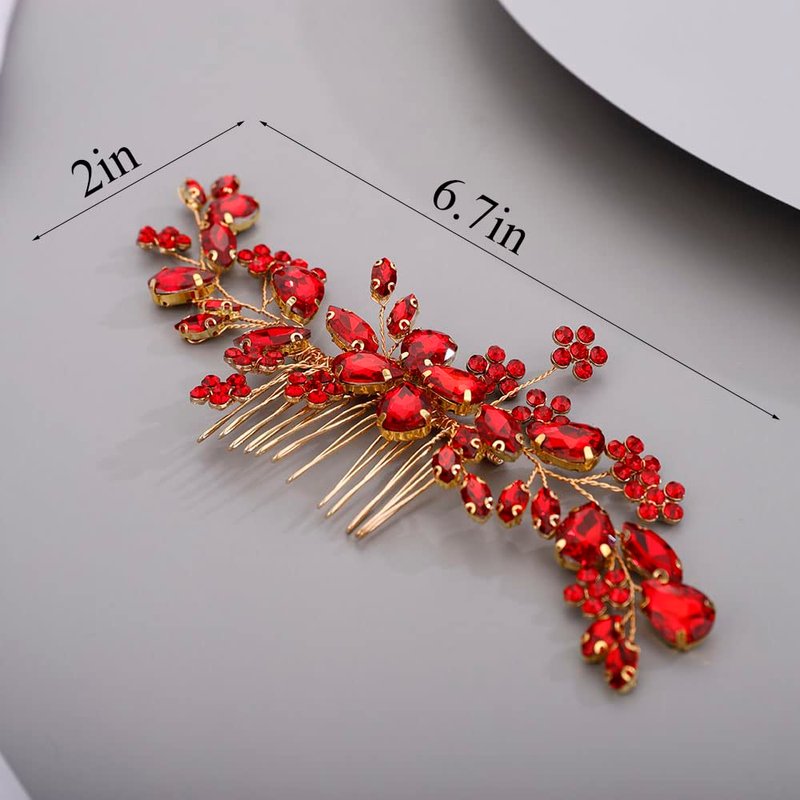 Chargances Bridal Wedding Crystal Hair Comb Handmade Flower Gemstone Hair Side Comb Red Rhinestone Headpiece Bridal Hair Accessories for Wedding Prom Flower Girl (Red)