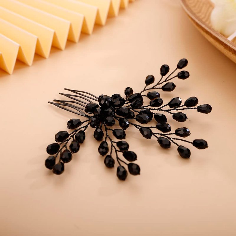 Chargances Rhinestone Bridal Wedding Hair Comb Black Flower Bridal Side Comb Beaded Crystal Hair Vine Pieces Handmade Hair Accessories for Women and Girls (Black)