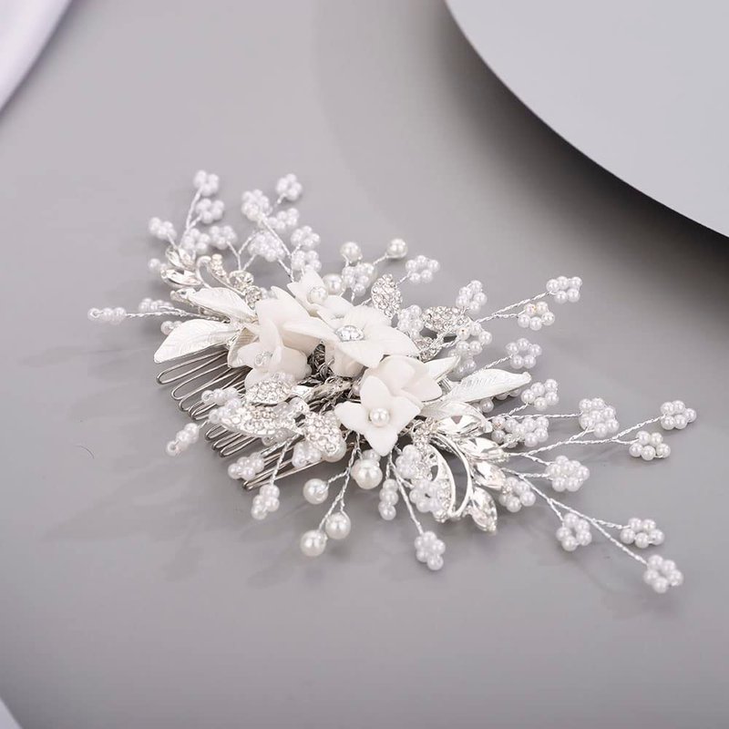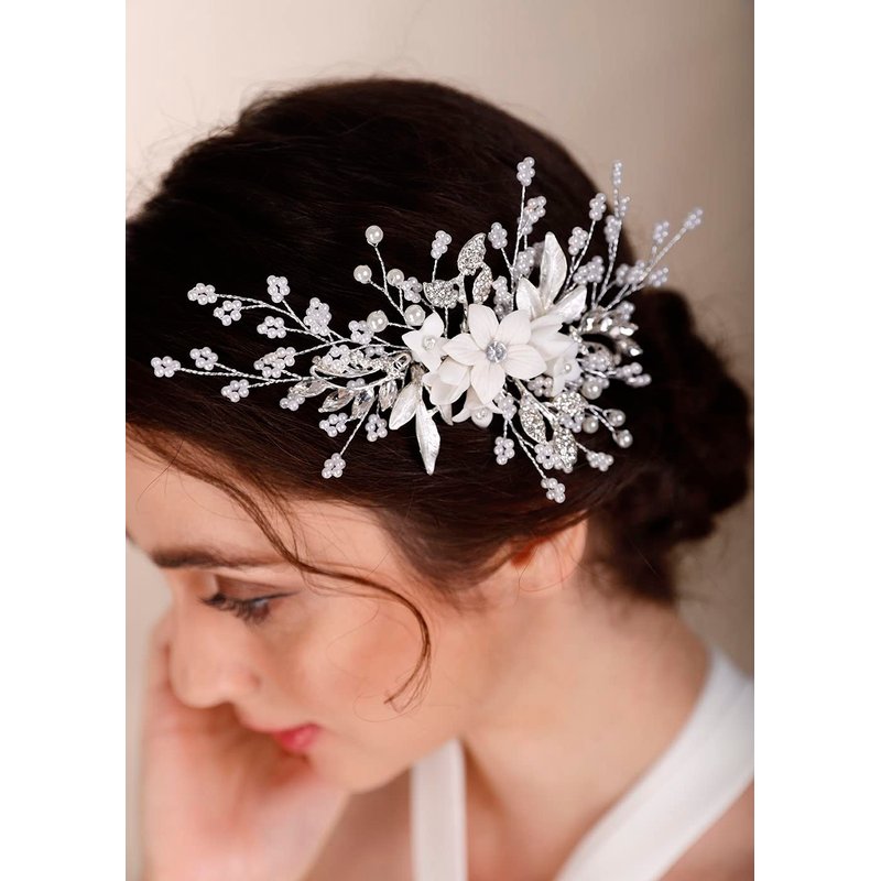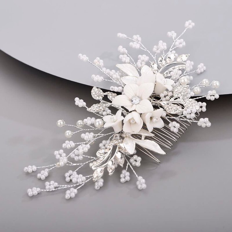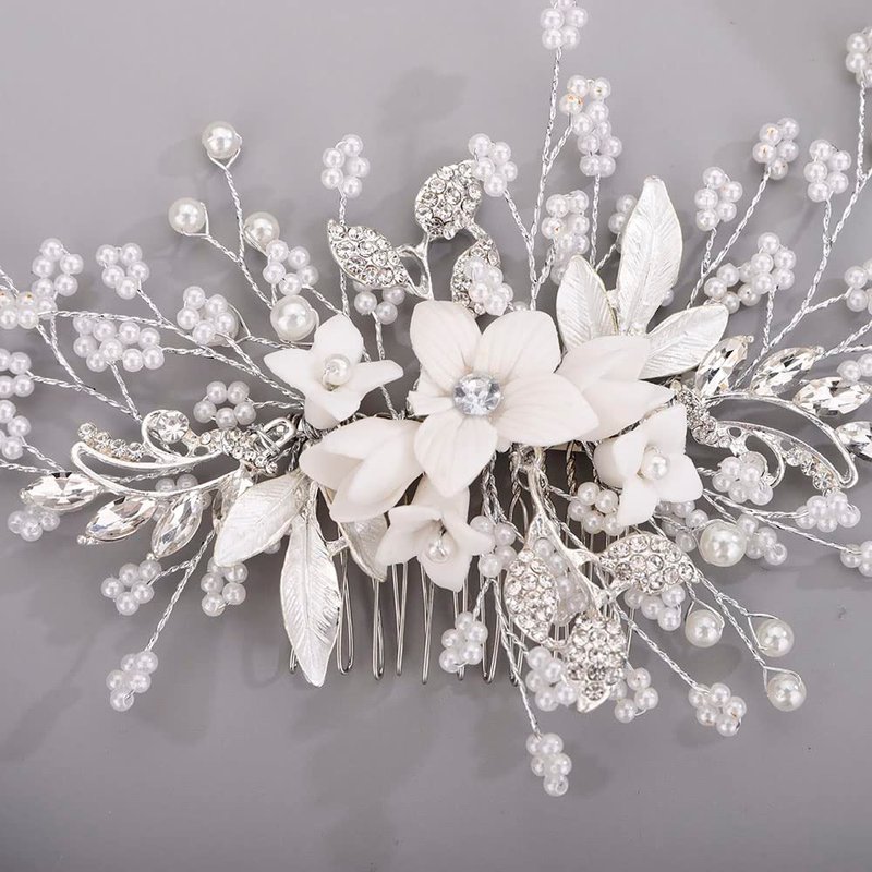 Chargances Silver Flower Pearl Hair Comb for Wedding Brides Bridesmaid Crystal Beaded Hair Comb Accessories Rhinestone Head Pieces for Women Girls Porm (Silver)