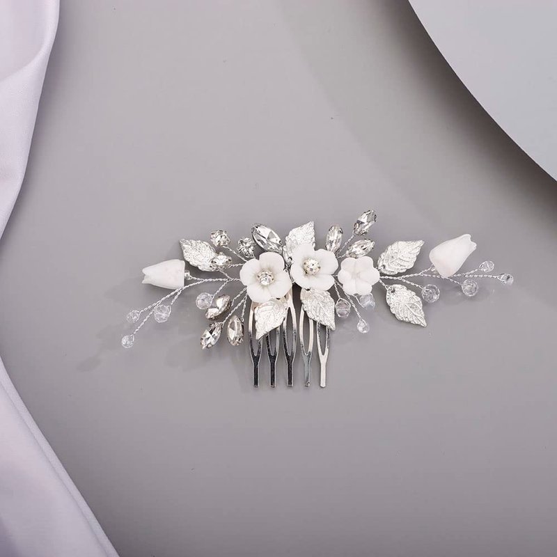 Chargances Wedding White Flower Rhinestone Hair Comb Bridal Silver Leaf Hair Side Comb Fashion Crystal Handmade Headpiece Hair Accessories for Women and Girls (Silver)