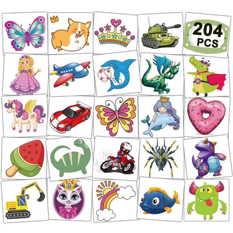 - ⚡Set includes 204 Mixed Styles Kids Temporary Tattoos -- Super adorable and fun kids temporary tattoos. This tattoo sticker set contains many fun elements that kids will like (Butterfly,Princess,Mermaid,unicorn,Dessert,Dinosaur,Robot,Racing Car,Space,Shark,Monster,Fish,Animals..). Add an individual extra touch of fun to a children’s party or event with Charlent tattoos.