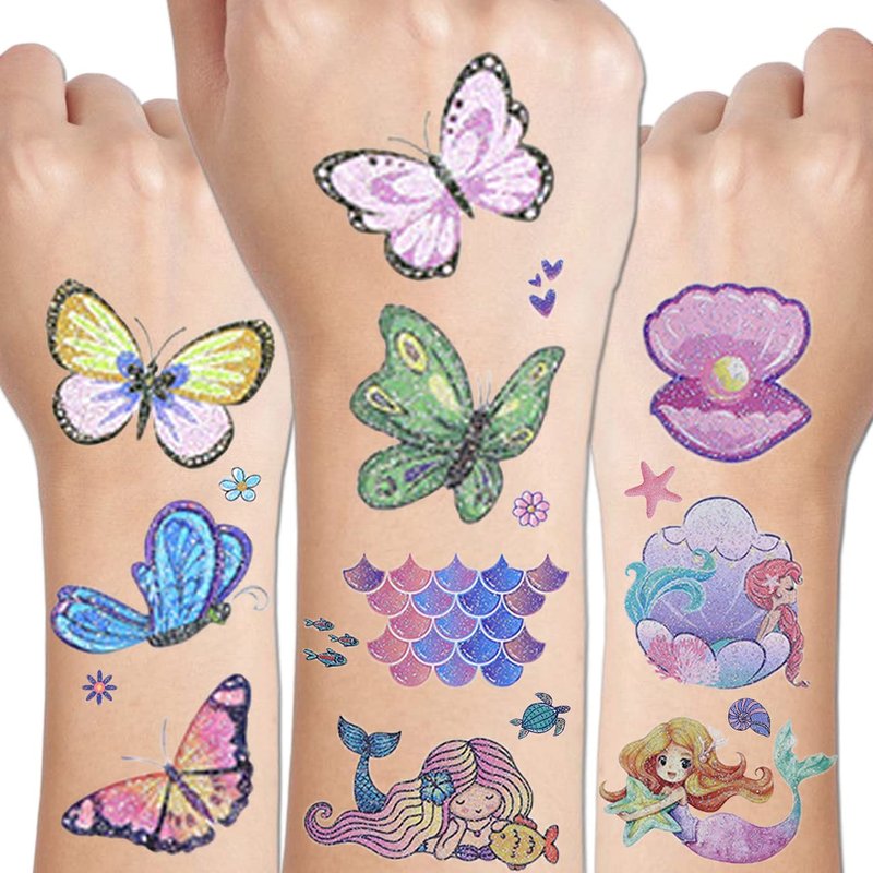 - ⚡24 Sheets Glitter Temporary Tattoos for Girls Women -- 240 PCS butterfly mermaid tattoos total in 24 sheets to be easily included in a party gift bag. Easy to share,even if a lot of people's parties, you can have a different tattoo with others.These adorable tattoos will keep you and your little ones – and their friends – occupied for a while. Great for playdates, parties, or rainy days.