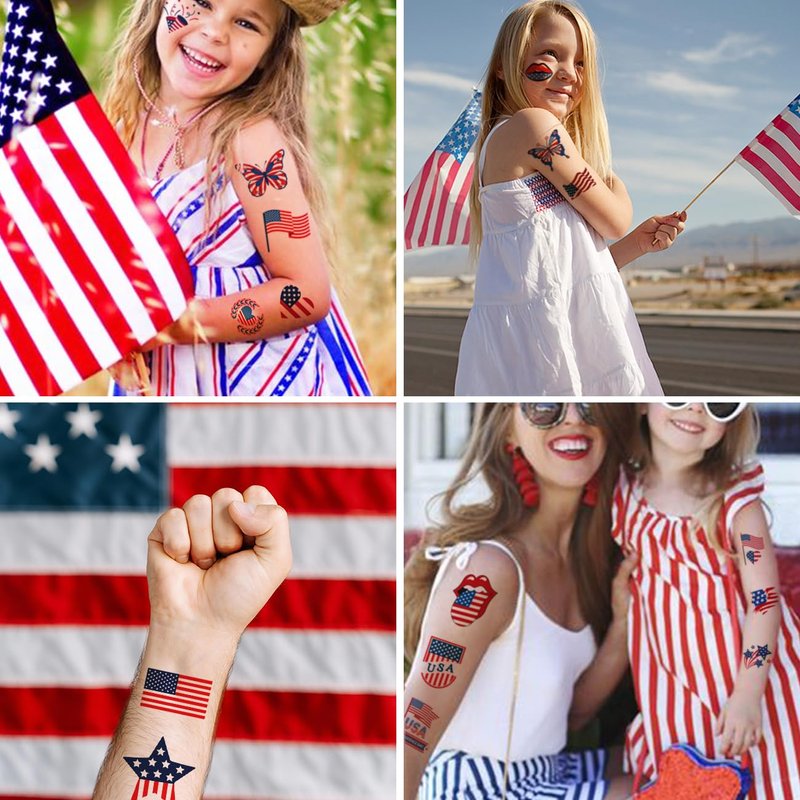 - ⚡Set Includes 148 Mixed Fourth of July Styles Temporary Tattoos for Independence Day Party Favors -- Super cool American Flag temporary tattoos,you can use for different locations on your face, arms, calves, etc. American Flag fake tattoos could be an excellent way to commemorate your patriotism.