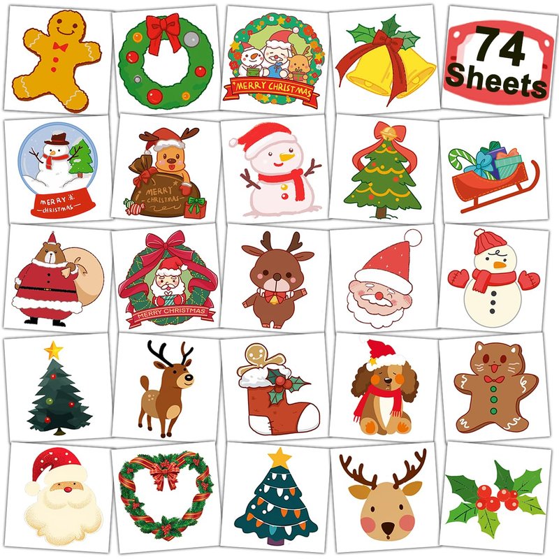 Package contents: There are 74 sheets of Christmas elements temporary tattoos