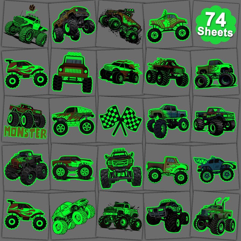 Package contents: There are 74 sheets of luminous Monster Truck elements temporary tattoos