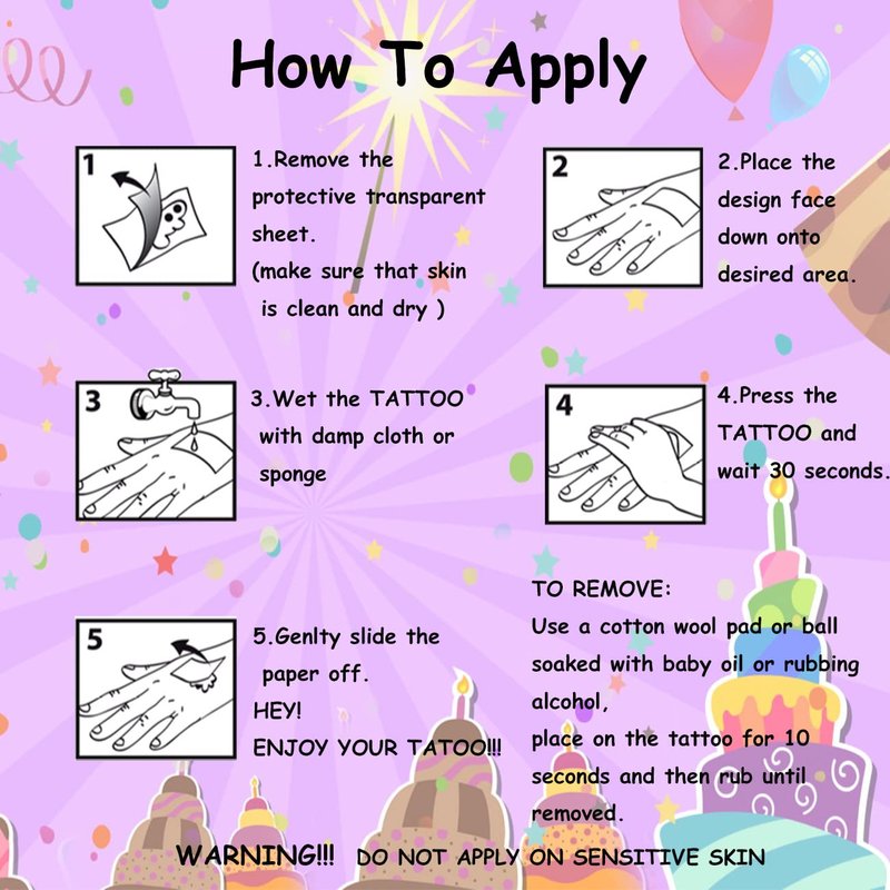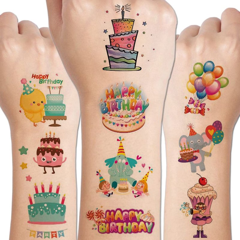 - ⚡14 Sheets Happy Birthday Temporary Tattoos for Girls Boys-- 120 PCS birthday tattoos total in 14 sheets to be easily included in a party gift bag. Easy to share,even if a lot of people's parties, you can have a different tattoo with others.These adorable tattoos will keep you and your little ones – and their friends – occupied for a while. Great for playdates, parties, or rainy days.
