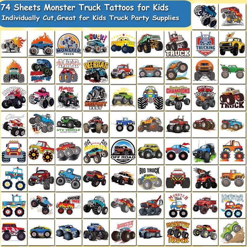 - ⚡Set Includes 74 Styles Monster Truck Temporary Tattoos for Kids Party Supplies-- Super cool and fun kids temporary tattoos. This tattoo sticker set contains many fun elements that kids will like. Add an individual extra touch of fun to a children’s party or event with Charlent tattoos.