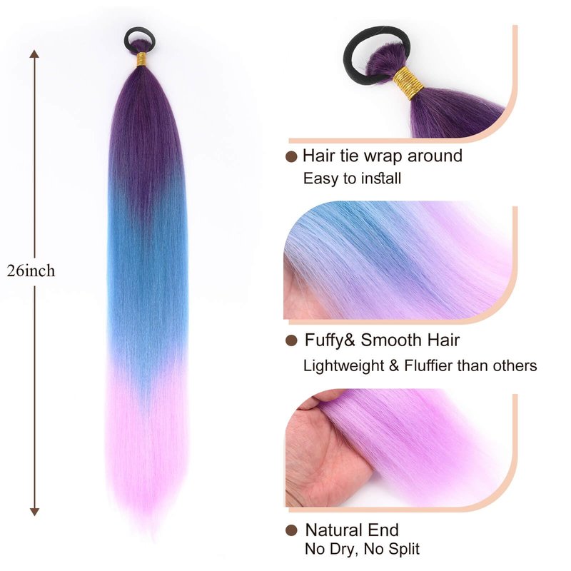 CHARSUN Braid Ponytail Hair Extensions with Elastic Tie,2 Pcs Straight Braid Hair Extension Rave Hair Natural Soft Hairpieces Synthetic Ponytail Extension 26 Inch(Purple/Blue/Light Purple)