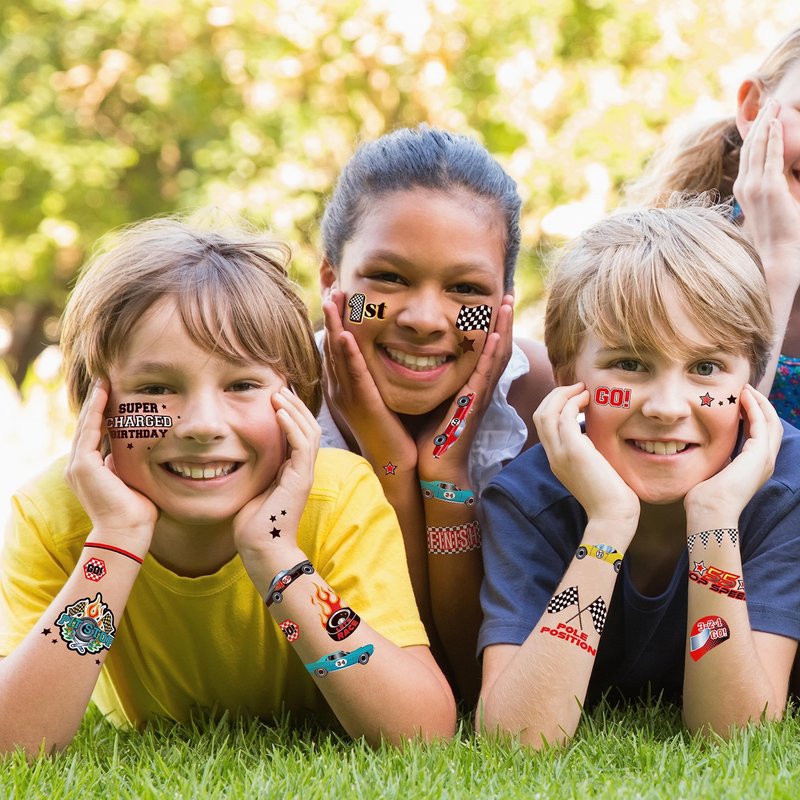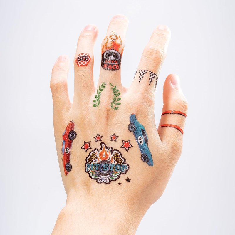 - PACKAGE INCLUDES:108 Race-themed tattoos; A variety of cars, helmets, finish lines, and trophy ; With speedy phrases like "Top Speed" and "Super Charged"