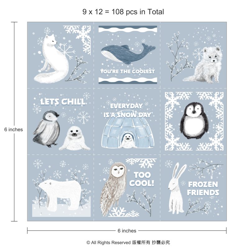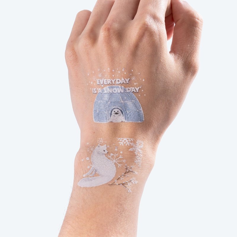 - [Package]: Delight in nine enchanting winter animal tattoo designs featuring favorites like the fox, seal, rabbit, whale, penguin, owl, and igloo seal. With 12 sheets and a total of 108 tattoos, there's plenty to share and enjoy!