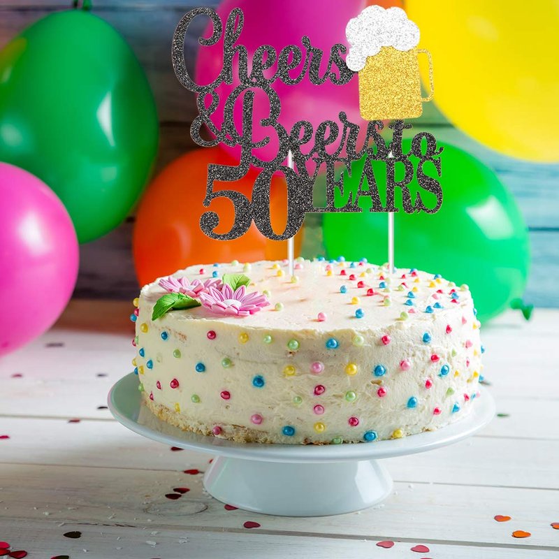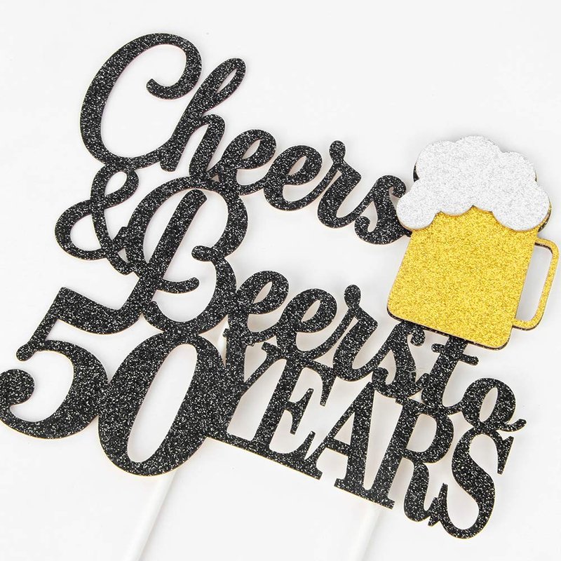 Cheers & Beers to 50 Years Cake Topper, Happy 50th Birthday Cake Topper, 50th Anniversary Party Supplies, Black Glittery