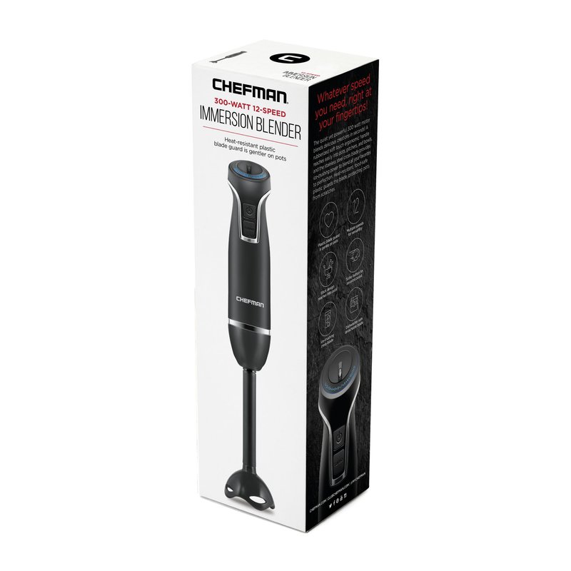 Chefman Immersion Blender 300-Watt Turbo 12 Speed Stick Hand Blender, Powerful Ice Crushing Design Purees Smoothies, Sauces & Soups, Detachable Heat Resistant Plastic Blade Guard Protects Pots, Black