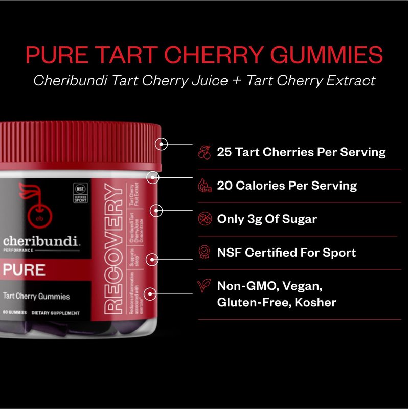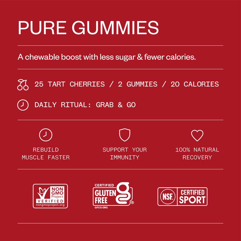 Cheribundi Tart Cherry Gummies Pure | Performance for Maximum Recovery with 25 Tart Cherries | Powerful Antioxidant Support, Non-GMO, Gluten-Free, Vegan | 20 Calories per Serving | 60 Count