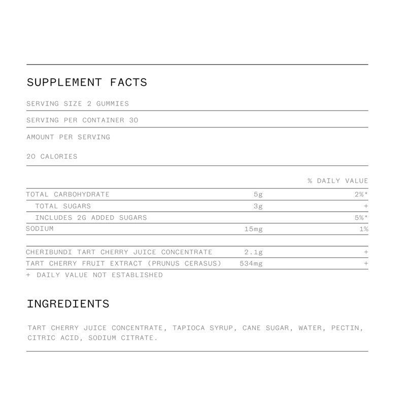 - POWERFUL RECOVERY AND PERFORMANCE SUPPORT: Delivers 25 tart cherries per serving to fight soreness and fatigue; antioxidant-rich gummies to support muscle recovery and post-workout performance.