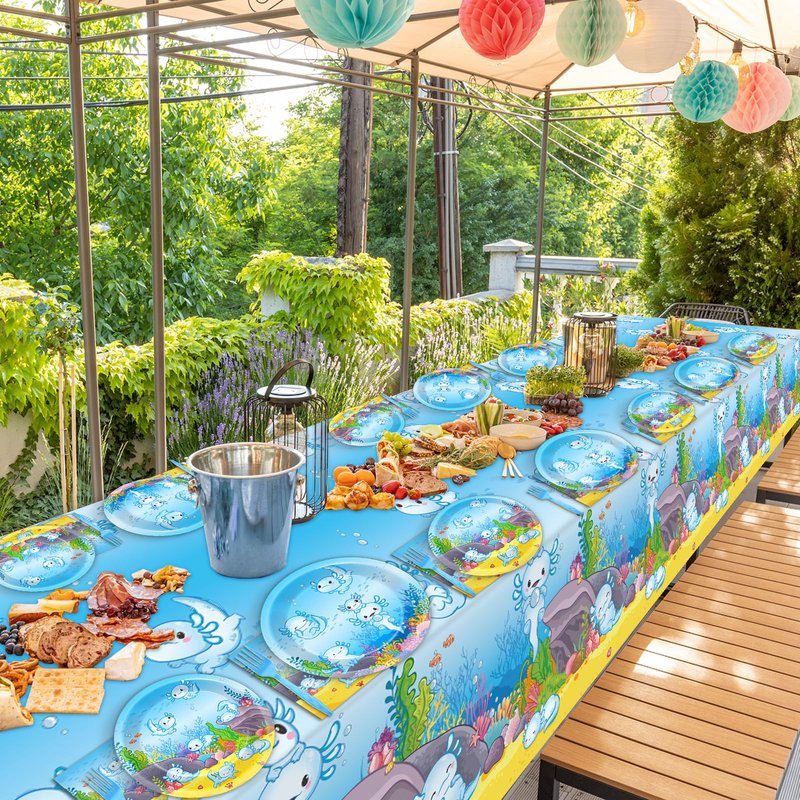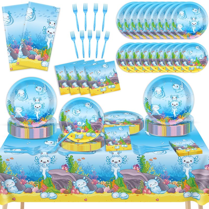 - Package includes: 98pcs of blue cartoon axolotl birthday party supplies sets include 24pcs of 9inch reptile animals party dinner plates, 24pcs of axolotl party dessert plates, 24pcs of forks, 24pcs of axolotl party napkins, and 2pcs of blue cartoon axolotl tablecloth for each set that can serve 24 guests, creating a visually stunning table decor for your party.