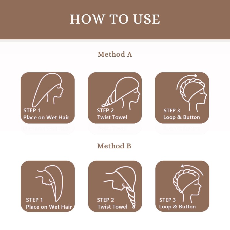 - 【SUITABLE FOR ALL HAIR TYPES】No matter what type of hair you have, our hair towel wrap is perfect for you. Simply place your hair inside, twist the hair wrap and attach the loop to the button to secure your hair without pulling or hooking the strands