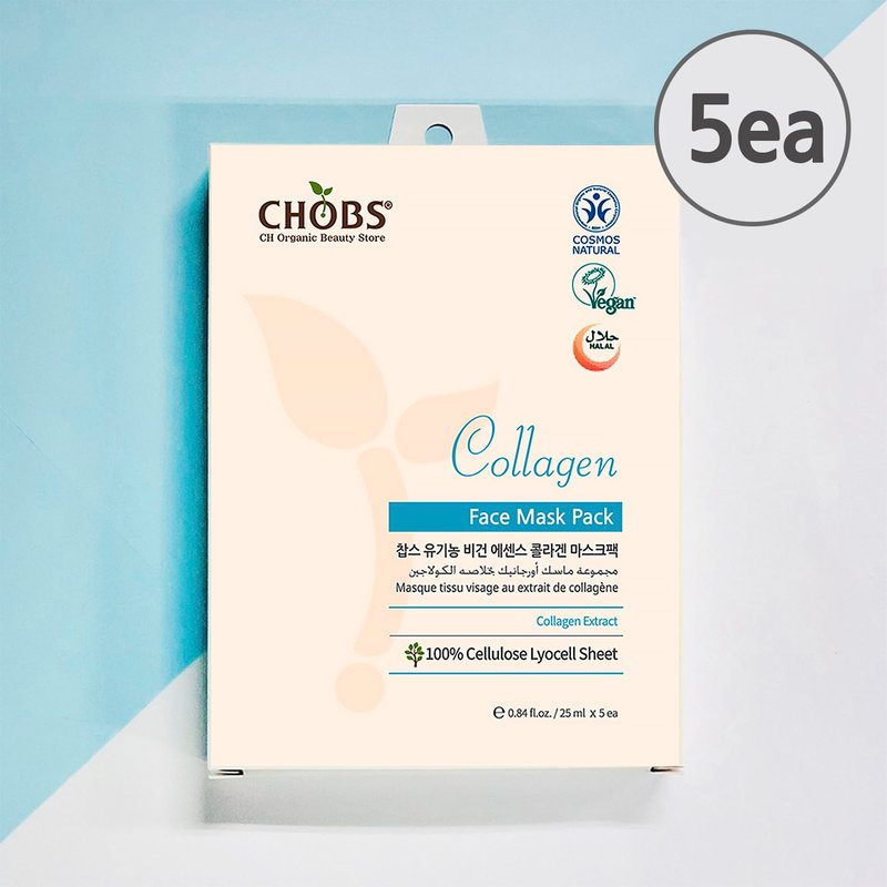 CHOBS Collagen 5 Pack Biodegradable Cellulose Lyocell Sheet Face Mask, Pore Minimizing, Improve Elasticity, Deep Moisturizing, Certified Vegan, Plant Based, Korean Skin Care