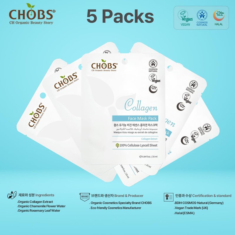 - Certified COSMOS Natural: The CHOBS Collagen Mask holds the COSMOS Natural certification, ensuring it’s crafted with naturally sourced, eco-friendly ingredients free from synthetic fragrances and harsh chemicals. This high standard of purity, quality, and sustainability provides a gentle yet effective mask that cares for both your skin and the environment. Embrace the best of eco-conscious Korean skincare with CHOBS.