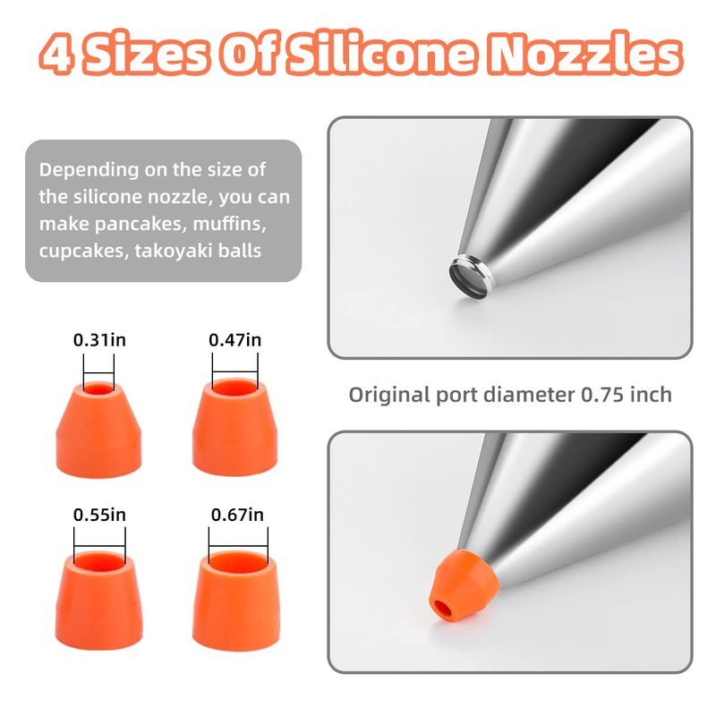 - 【Package】This batter dispenser package contains 1 x pancake dispenser for batter with stand, 1 x grip handle and 4 x different caliber silicone funnel.Silicone funnel sizes are: 0.31", 0.47", 0.55", 0.67" and the dispenser itself has a 0.75" spout. Capacity: 5 cups / 1.2 liters.