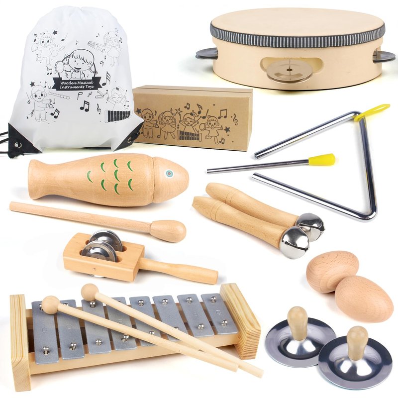 Chriffer Kids Musical Instruments Toys, Percussion Instruments Set with Xylophone, Preschool Educational Music Toys for Boys Girls, Natural Eco-Friendly Wooden Music Set (8)