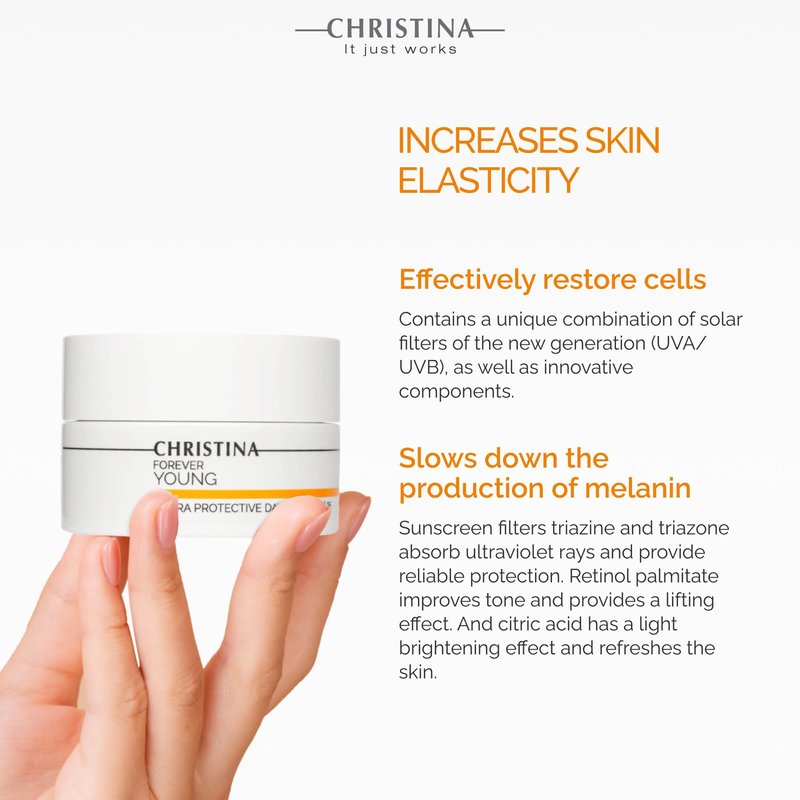 Indulge in the elegance of Christina Forever Young Hydra-Protective Day Cream, specially crafted for combination, normal, and dry skin. This hydra-protective care ensures a radiant and protected complexion throughout the day. With SPF 25 protection, this day cream acts as a shield against sun damage, keeping your complexion healthy and glowing. Experience a moisture infusion that keeps your skin hydrated and supple, thanks to our balanced formulation. Indulge in daily hydra-protective care with the convenience of a 50ml size, ensuring prolonged benefits for your combination, normal, and dry skin. Related face moisturizer for women, anti aging moisturizer, productos para cuidado de piel facial, face moisturizer anti aging, daily moisturizer for face, skin care moisturizer, facial cream, face moisture for women, anti aging cream, facial lotion for women, daytime moisturizer for face, anti aging face moisturizer for women, aging skin care for women, firming cream for face and neck, daily face moisturizer, facial moisturizer for women anti aging, best anti aging skin care products, best face cream for aging skin, day moisturizer for face, spf face moisturizer, face cream with spf, day cream for face, face moisturizer spf, best face moisturizer with spf, daily facial moisturizer, sensitive face moisturizer, "face moisturizers, spf 25 face moisturizer"