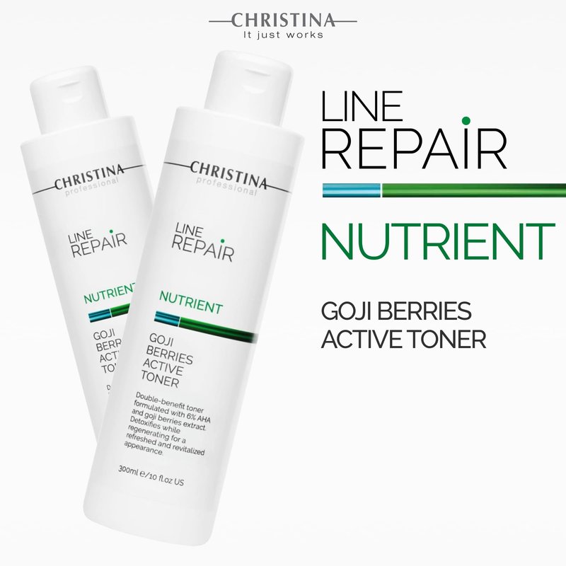 Discover the transformative power of Christina Line Repair Nutrient Goji Berries Active Toner, a 300ml elixir designed for oily, combination, and normal skin. Immerse yourself in the benefits of our superfood-enriched tonic, featuring glycolic and malic acids to exfoliate, regenerate, and enhance blood circulation in the skin. Goji berries, known as the ""fruits of the future,"" restore vitality and stimulate tissue renewal, while wormwood and kale extracts, rich in phenolic compounds, tannins, and flavonoids, act as excellent natural agents for detoxification. Ideal for addressing acne, rough skin, greasy shine, and black dots, this toner becomes an essential part of your daily skincare routine. Application is effortless – apply on a cotton pad, treating the face, neck, and décolleté area after preliminary makeup removal and surface cleansing. Suitable for all age groups, Christina Line Repair Nutrient Goji Berries Active Toner elevates your 24-hour care routine, ensuring your skin receives the pampering it deserves. Embrace the radiant beauty within and let your skin flourish with the touch of Christina Line Repair. Related hydrating toner for face, moisturizing toner, skin toner for face, best toner for aging skin, toners for face, face toner for oily skin, skin toner for women face, "skincare toner, pore reducing toner"