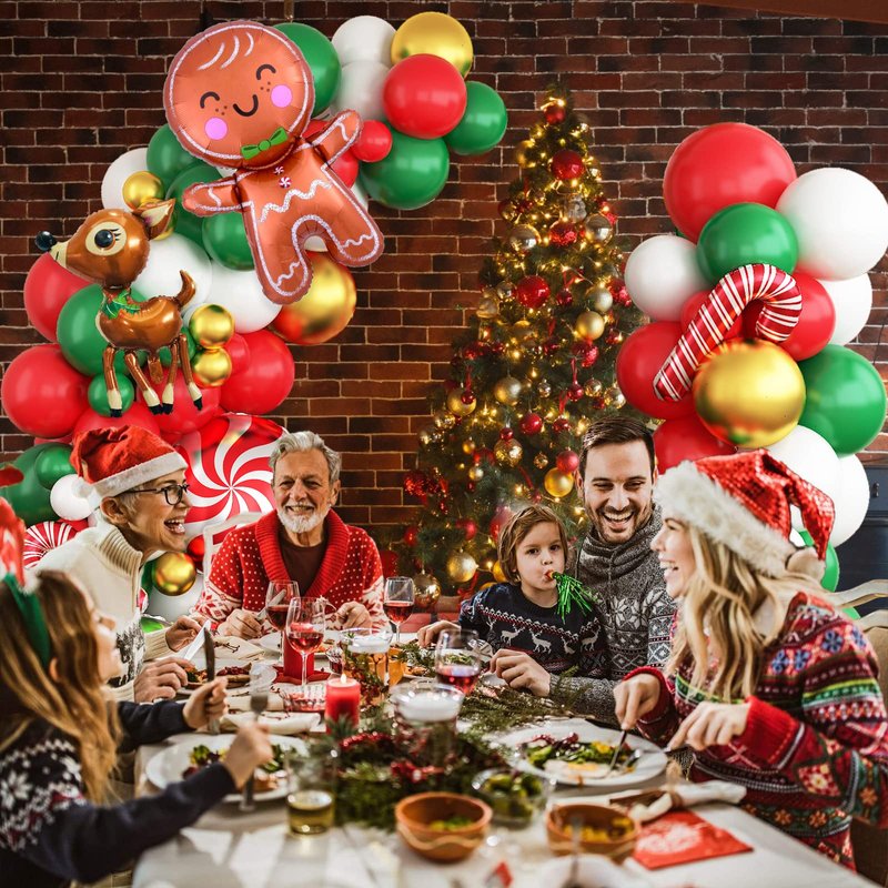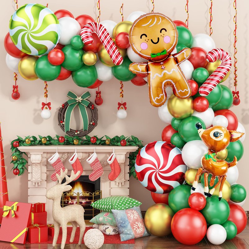 - Red Green Christmas Balloon Arch Kit: include 20x10 inch matte red balloon, 20x10 inch matte dark green, 15x10 inch matte white, 5x 12inch metallic gold, 8x5 inch matte red, 8x5 inch matte dark green, 8x5 inch matte white, 5x 5inch metallic gold, 1x gingerbread man foil balloon, 2x candy cane, 1x elk, 2x windmill foil balloons,1 x Balloon chain; 3 x Dispensing. Various sizes balloon can make your balloon arch look more layered.