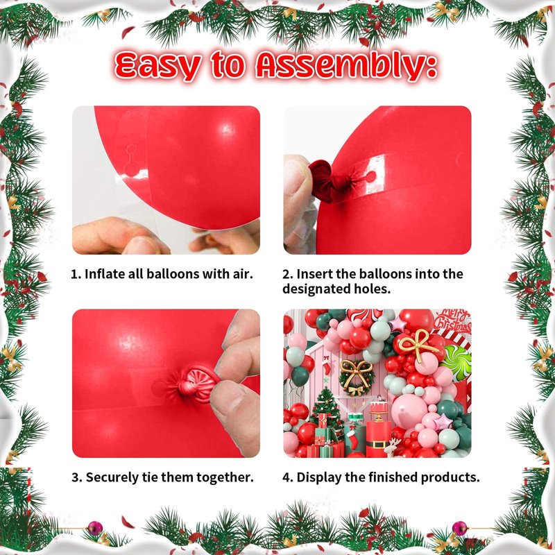 - [Effortless Setup] Our Christmas balloon set comes with essential tools like ribbon, balloon strips, and adhesive tape, making it simple to create a stunning balloon arch garland. Enjoy a memorable experience with your family as you decorate together!