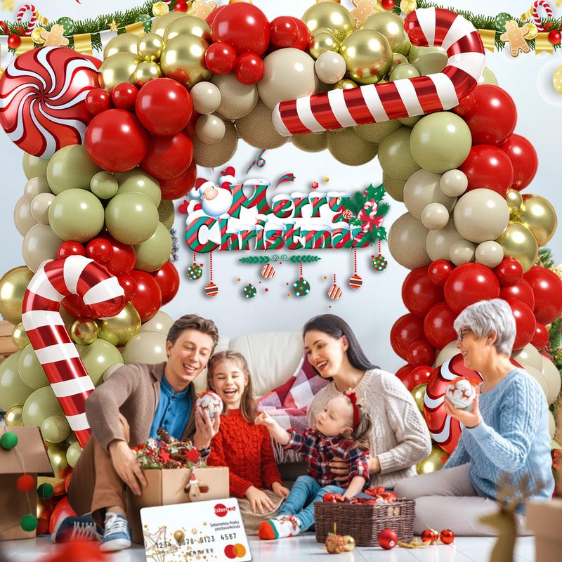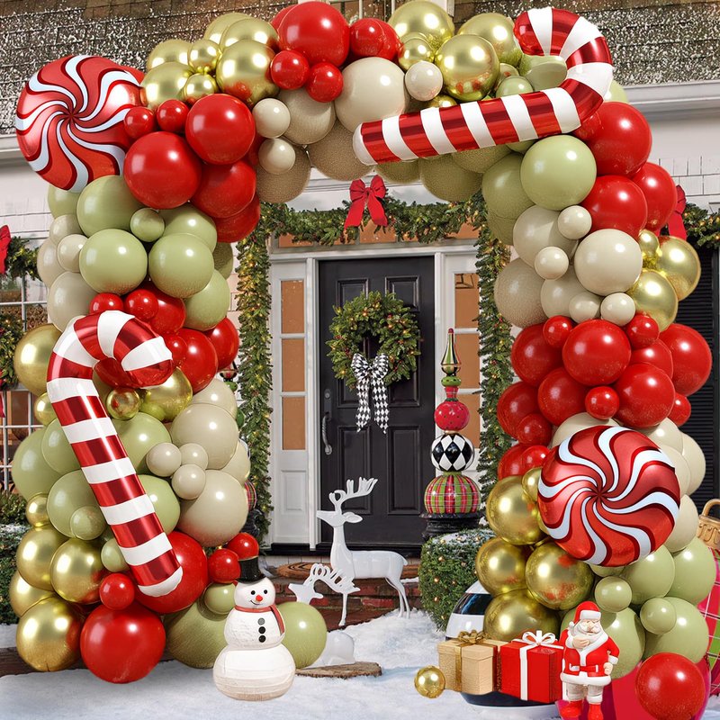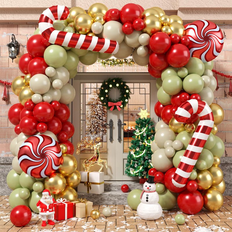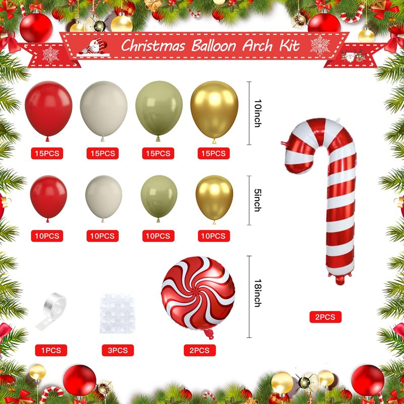 - Christmas Balloon Garland: The Christmas balloon arch kit including matte red balloons (10*5inch, 15*10inch), sage green balloons (10*5 inch, 15*10inch), retro sand white balloons (10*5 inch, 15*10inch), metallic gold balloons (10*5 inch, 15*10inch), 2* 18 inch cane Christmas balloon, 2* 18inch candy foil balloon. 1pc balloon strip tape, 3pcs balloon dispensing