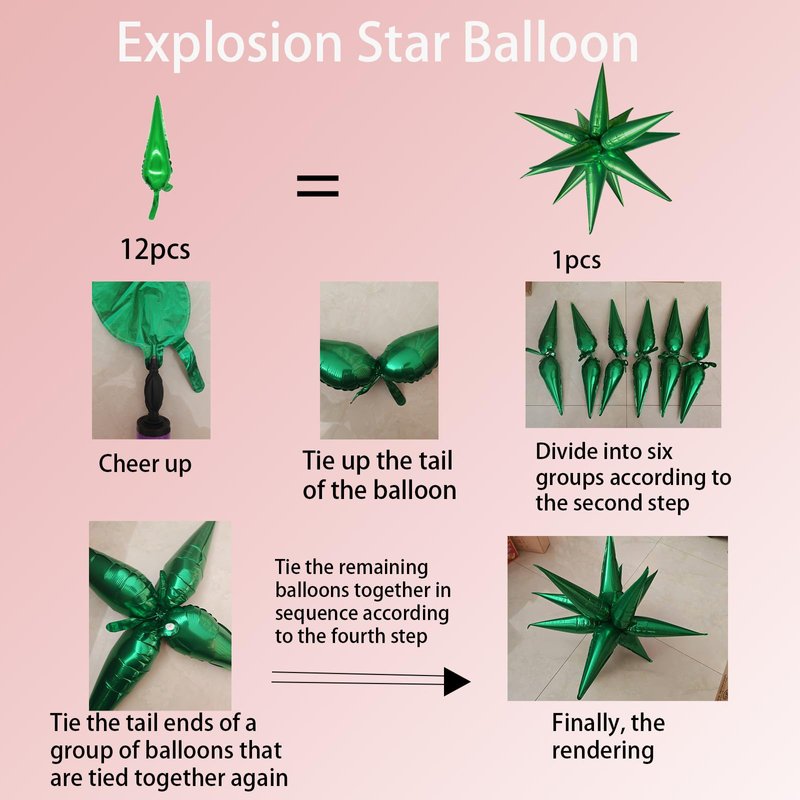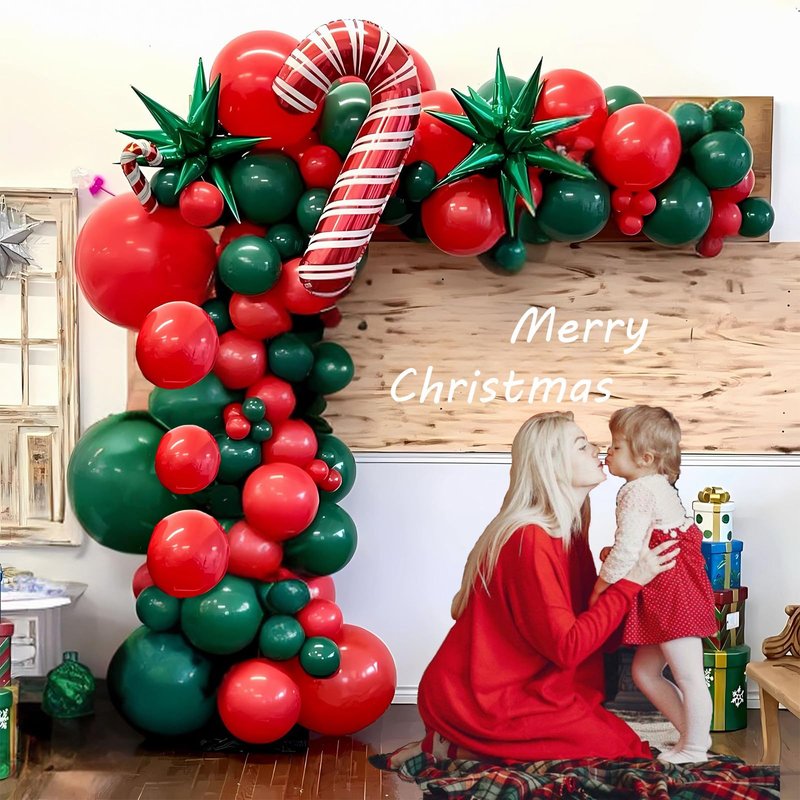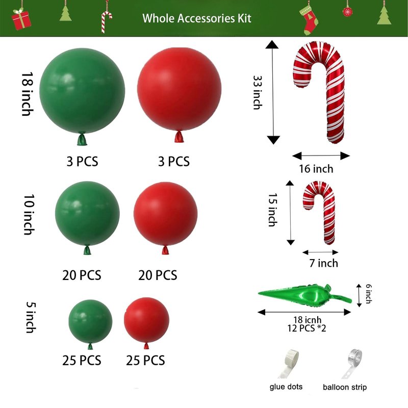 - Packaging Includes: 43pcs green latex balloon(25pcs 5in,20pcs 10in,3pcs 18in).43pcs red latex balloon(25pcs 5in,20pcs 10in,3pcs 18in).2pcs red candy cane balloon(1pcs 32in,1pcs 15in).1pcs Explosion Star Balloon(composition 12pcs 18in green cone balloon).Whole Balloon Garland Accessories Kit :1pcs long balloon decorating strip tape,100 pcs balloon glue.