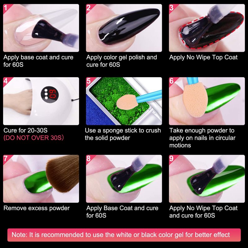 - WIDE APPLICATON & EASY TO USE - Chrome powder for nails can be applied on U V gel nails, acrylic nails, natural nails, and can be mixed into nail gel polish for its solvent resistance. It is easy to use for both beginners and professionals, no special nail techniques are required, just follow the instructions and you will get an amazing mirror effect manicure
